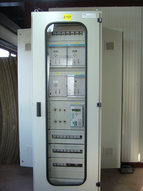 За нуждите на енергетиката предлагаме разработен релеен шкаф с 19” модули с различна големина (U), разположени на въртяща се рама с удобен достъп до елементите.Шкафът е с предна прозрачна врата и две плътни задни врати.