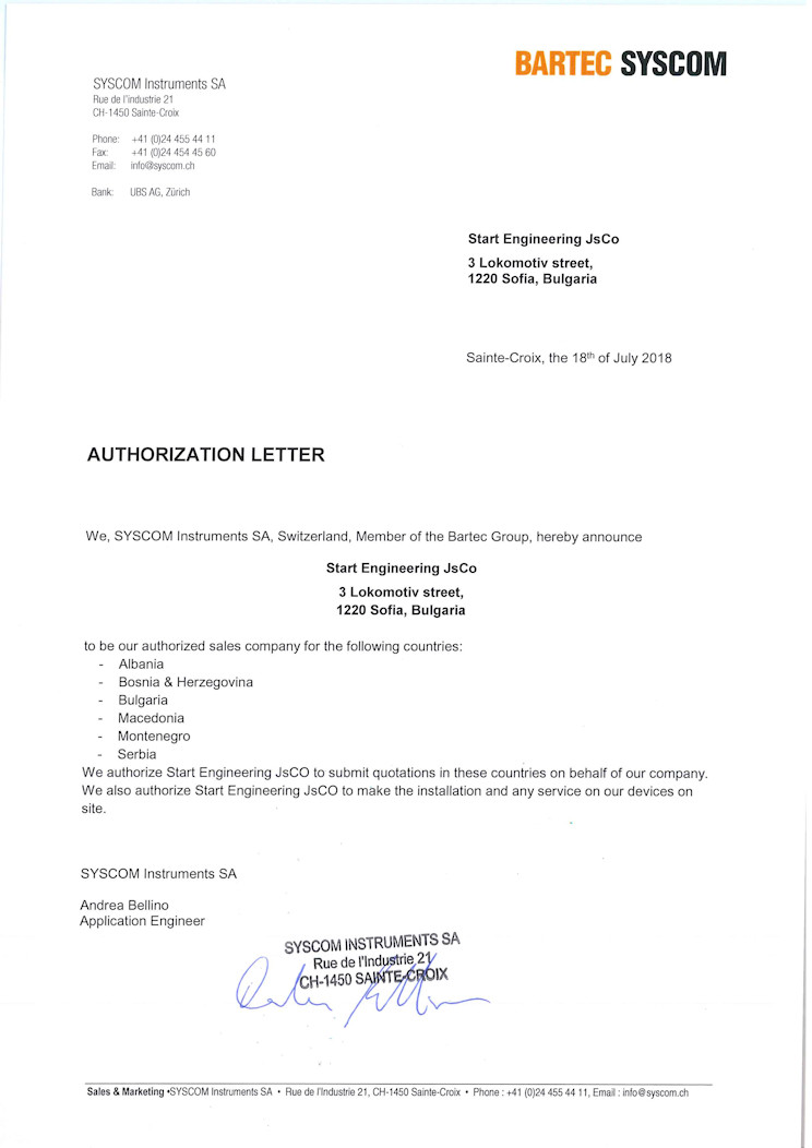 "Старт Инженеринг" АД, благодарение на успешно инсталиране на системи за сеизмичен мониторинг на язовирите Цанков Камък и Пловдивци и текущото въвеждане в експлоатация на такава система на язовир Студена, стана официален представител на швейцарската фирма Syscom Instruments SA, член на групата Bartec (един от световните лидерите в производството на апаратура в този специфичен сектор) за България, Албания, Македония, Босна и Херцеговина, Сърбия и Черна Гора.